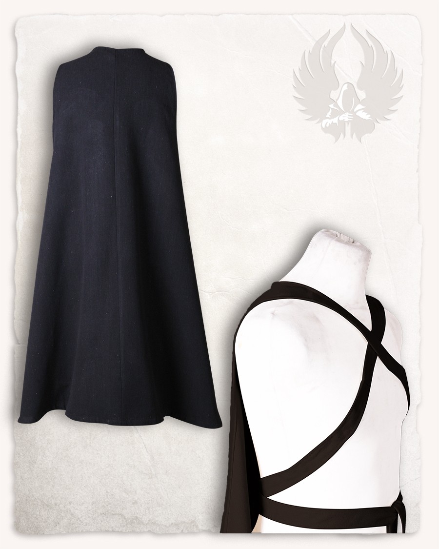 A simple but stylish cloak. What is special about it is the binding. Two long straps have to be crossed over the chest, behind the back and knotted around the belly. Thus the cloak stays in place and does not pull at the throat even if the wearer is moving a lot. It goes along perfectly well with armour as it will cover the binding in the front and the cloak will fit nicely around the collar.